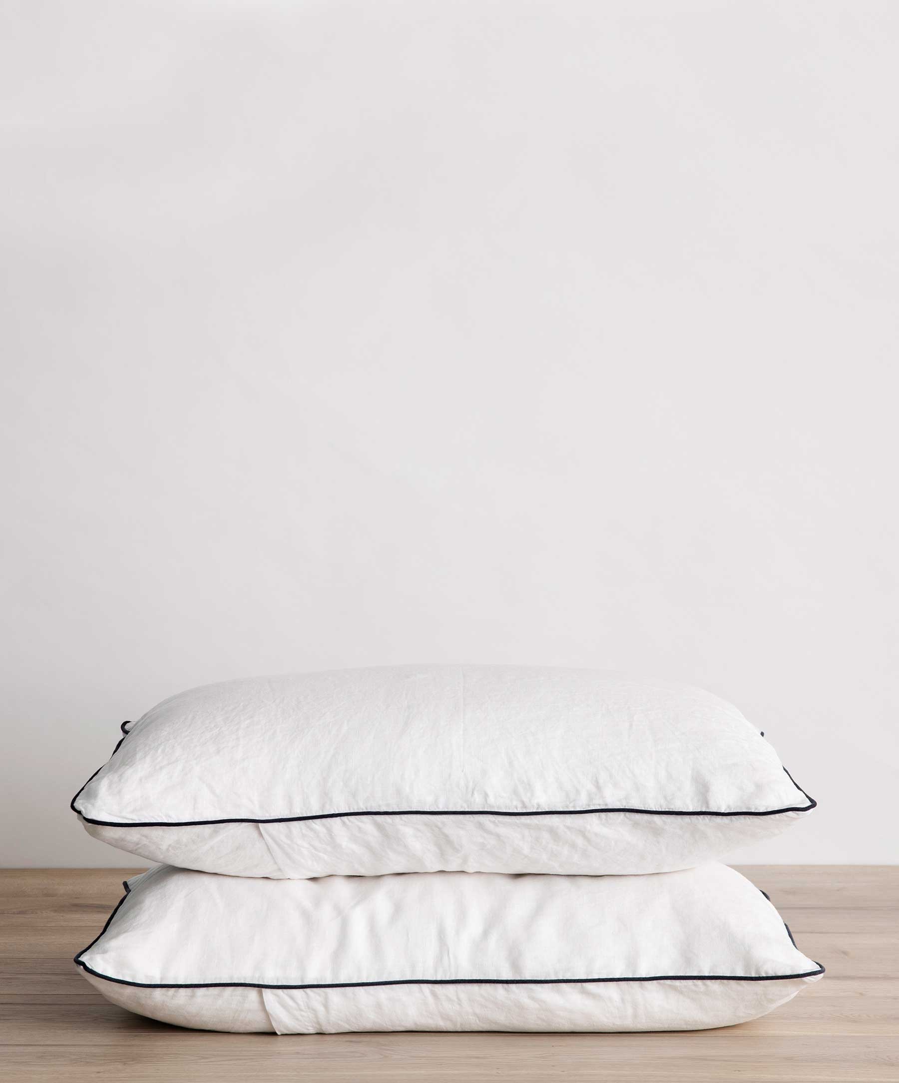 Lot de 2 taies d'oreiller passepoilées en lin - Blanche et bleu marine